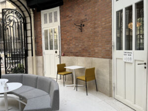 以前はマレ地区にあったカフェがここに移転していて、一般の人も入ることができるんです。テラス席もあってとても居心地がよさそうです。