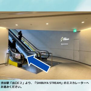 D’abord, quittez la gare en utilisant la « sortie C2 » , puis montez les esclators juste en face de vous jusqu’au bâtiment « SHIBUYA STREAM»(渋谷ストリーム).