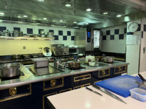 教室からは窓ガラス越しにホテルの厨房で実際に働く料理人さんや、パティシエさんの様子が覗けるようにになっていて普段は見ることのできないホテルの裏側やホテルで働く人たちを見ることができます。この日使ったお料理コースの教室の窓からは三ツ星レストラン「エスパドン」の厨房を覗くことができ、先生からそのことが説明されると生徒さんたちからも「ワオ」と歓声が。