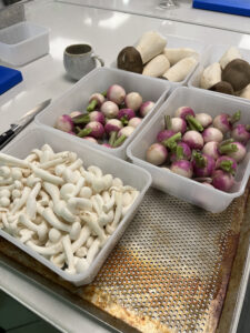 この日シェフが使った食材の中にはエリンギやしめじ、水菜などの日本の野菜が多く使われていてあまりこれらの野菜に馴染みのない生徒さんからはこのきのこはなんですか?という質問が出たり、シェフから「この野菜はなんという名前か知っている人〜?」とクイズも出されたりしました。