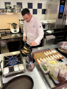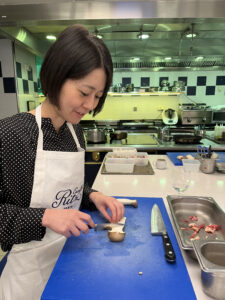 シェフのデモンストレーションを見て、今度は私たちが作業をします。一人ひとりに作業場が設けられていてエプロンをつけて料理開始!(エプロンは終了後にお持ち帰りができます)。