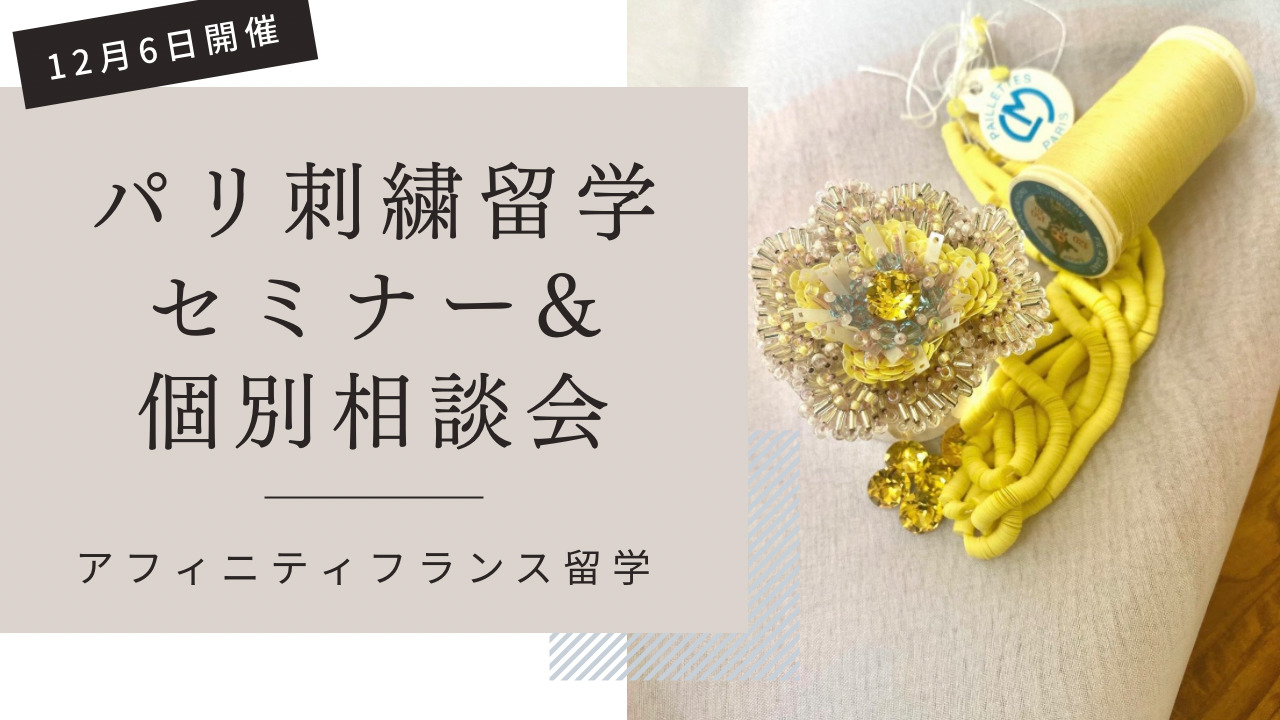 フランスで刺繍を習得するための留学をしたい!という方へ向けたパリ刺繍留学セミナーを開催します。当日は名古屋で刺繍とフランス語の教室Salon du mugetを運営され、実際にパリでの留学経験をお持ちのNahomi先生をお招きし、刺繍留学に関するセミナーと個別相談会を開催いたします!