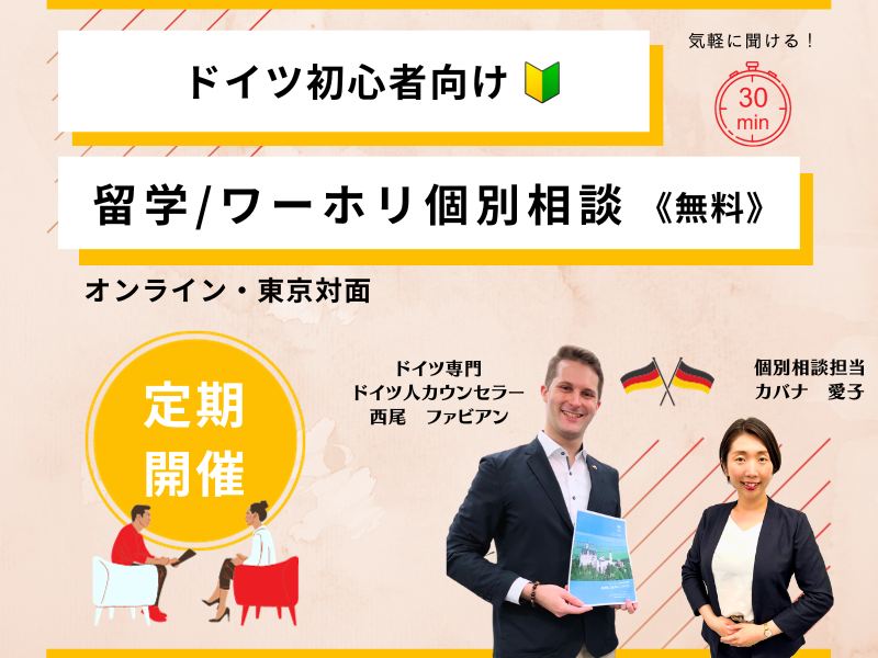 約30分ほどのドイツの基本に関する個別相談ですので、ドイツに初めていく方や、まだ情報収集を始めたばかりという方にオススメです。
