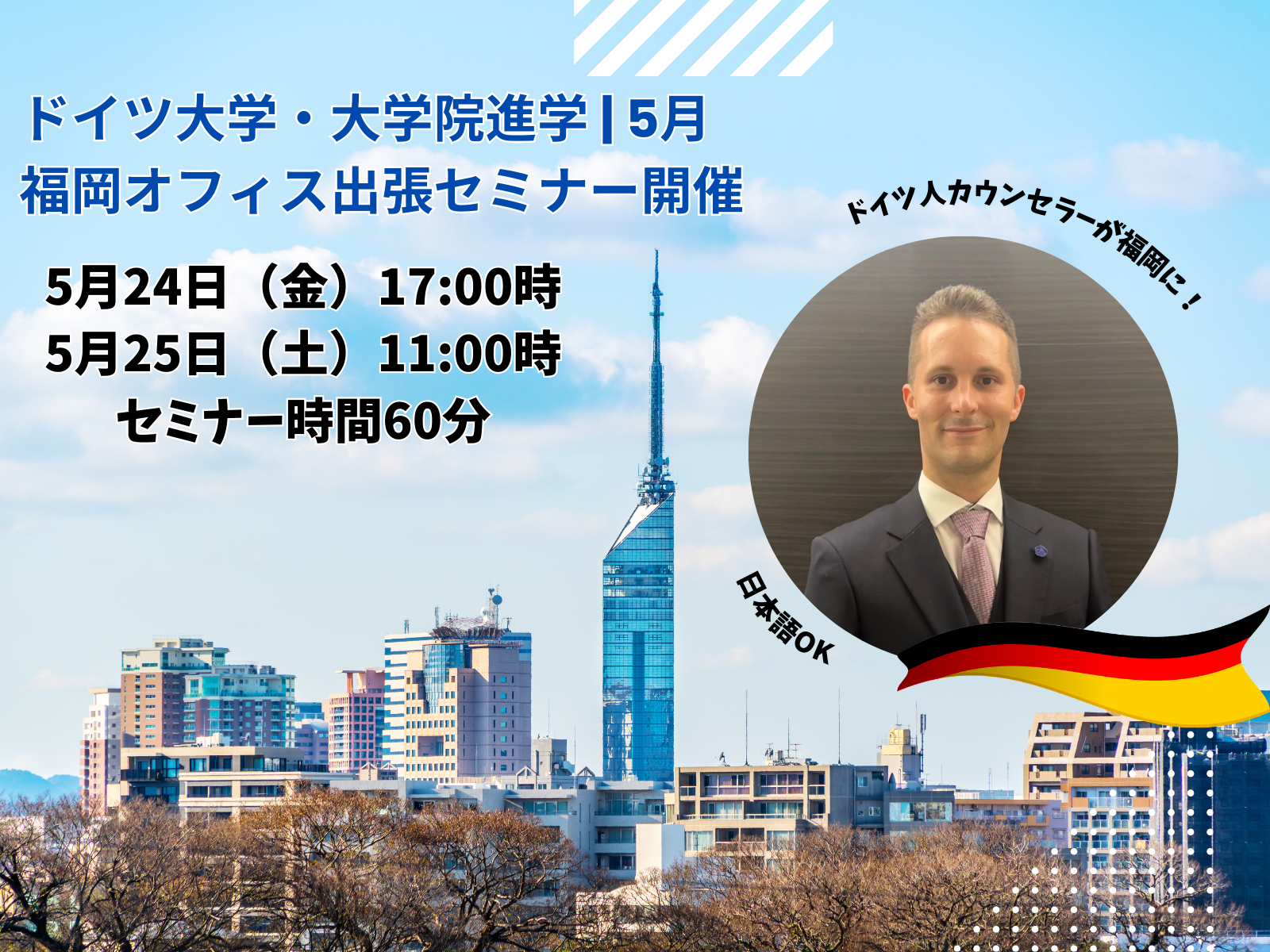 2024年5月24日(金)、25日(土)の2日間、ドイツ留学カウンセラーの福岡出張に合わせてドイツの大学や大学院への進学を希望する方向けのセミナーを開催したいと思います。